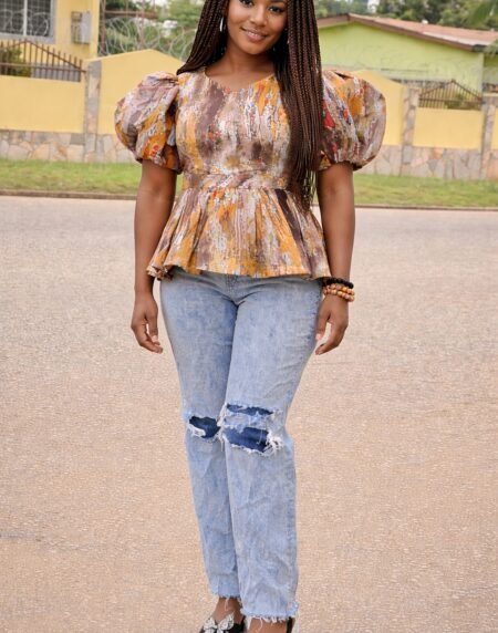Vibrant African print peplum blouse with circular pattern, flared sleeves, and tailored fit. Perfect for work, events, and stylish cultural wear.