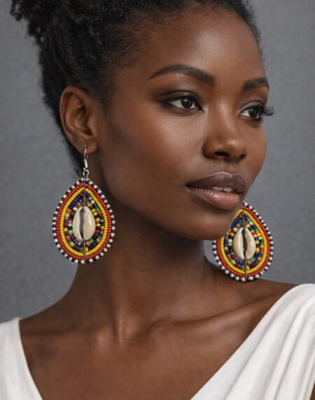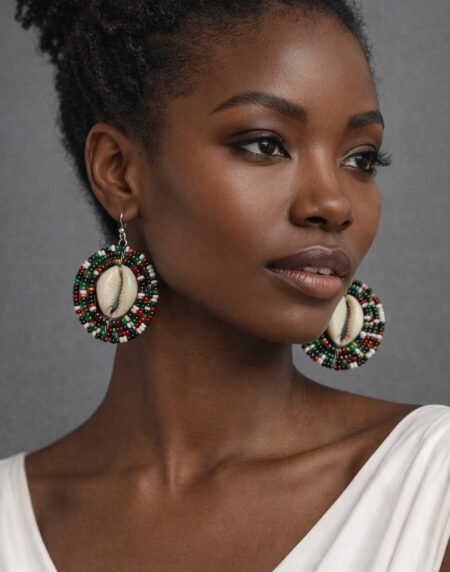 Handcrafted African beaded cowrie shell earrings featuring vibrant colours and a bold circular design. Lightweight, cultural, and perfect for statement styling.