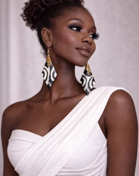 African-inspired geometric drop earrings in bold black and white. Lightweight, elegant, and perfect for adding a modern statement to any outfit.