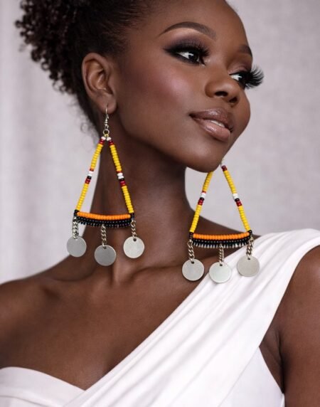 Handmade African beaded fan drop earrings with vibrant colours. Lightweight, bold, and perfect for adding cultural style to everyday or occasion wear.