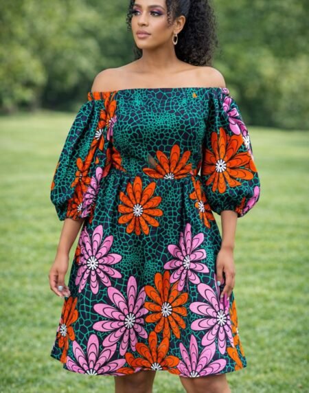 Elegant Off-Shoulder African Print Floral Dress – Bold Ankara Puff Sleeve Dress