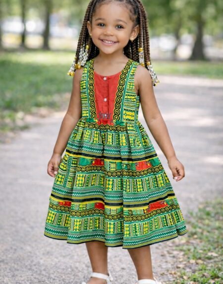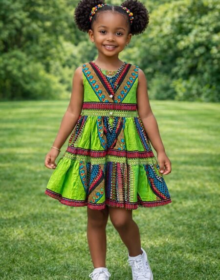 Girls green Ankara tiered dress with vibrant African print. Stylish, comfortable, and perfect for parties, church, photoshoots, and special occasions.