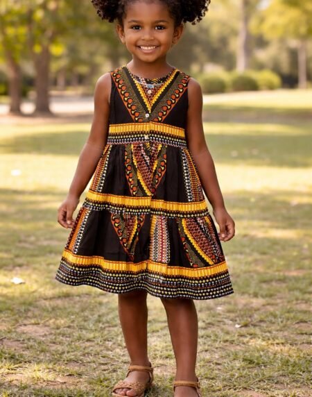 Girls black and gold Ankara tiered dress with vibrant African print. Stylish, comfortable, and perfect for parties, church, photoshoots, and special occasions.
