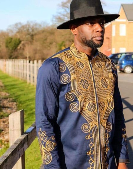 From our attractive menswear range is this fabulous men's navy blue shirt with gold African embroidery detail on the front for a stylish, elegant look. Perfect for weddings or other formal occasions!