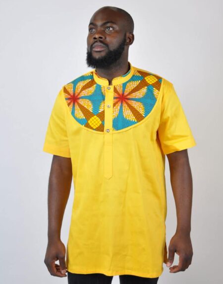 Yellow African Shirt with Multi-Colored Collar. Attractive African men`s wear fit for all occasions. This unique out fits make you stand out of the crowd. Compatible for both casual and event wear.