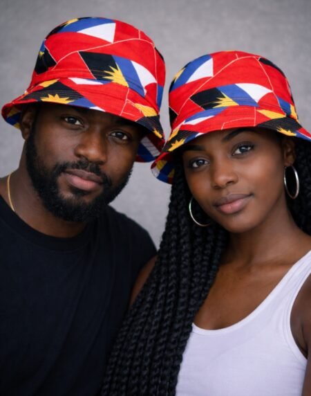 Antigua Reversible Bucket Hat with bold cultural colours and sun motifs. Lightweight, unisex, and stylish with two looks in one versatile design.