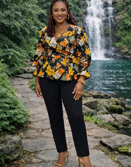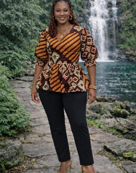 Elegant African print wrap peplum blouse in vibrant tones. Perfect for work or events, combining cultural style, flattering fit, and modern sophistication.