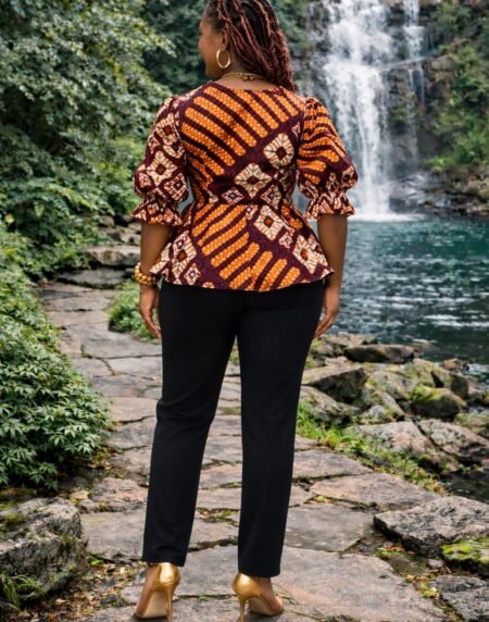Elegant African print peplum blouse with puff sleeves and V-neck. Perfect for work, events, or smart-casual styling. Customisable fit, vibrant wax print design.