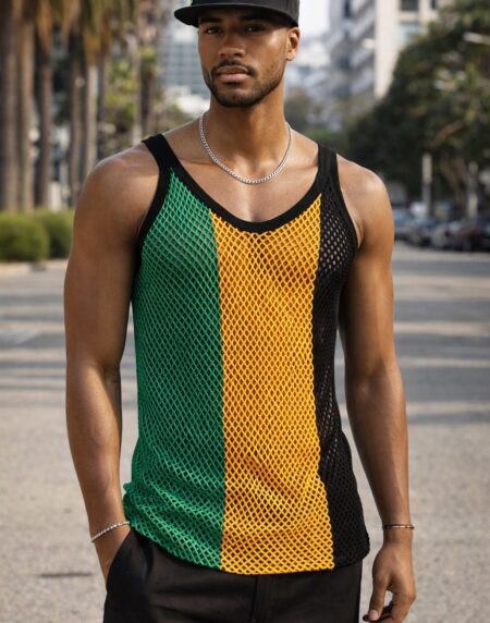 Jamaican flag mesh vest in breathable fabric. Perfect for Carnival, festivals, sports events, and bold summer streetwear style.