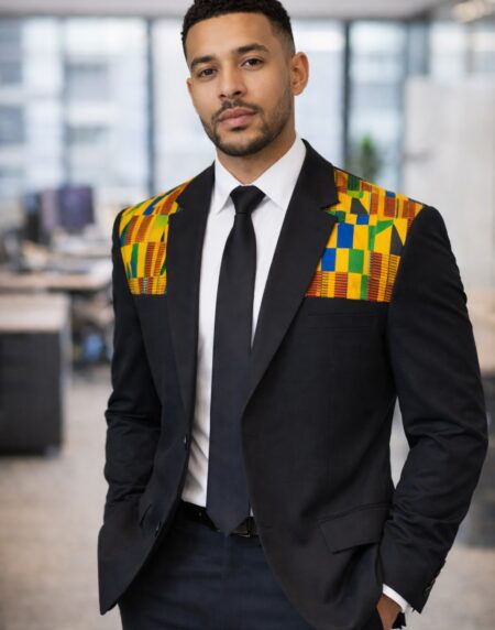 Heritage Kente Accent Office Suit Jacket with tailored fit and subtle African-inspired detailing. Ideal for work, meetings, and formal events.