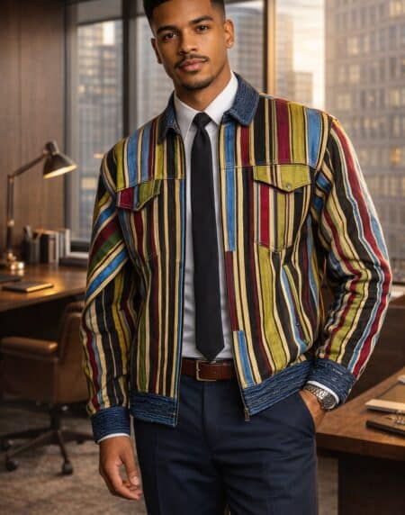 Shop a refined African-inspired office jacket with heritage stripe design. Tailored for professionals who want culture, confidence, and modern executive style.