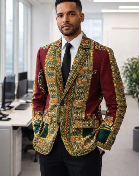 African-inspired executive jacket combining tailored office style with bold Dashiki patterns. Refined, professional, and culturally expressive.