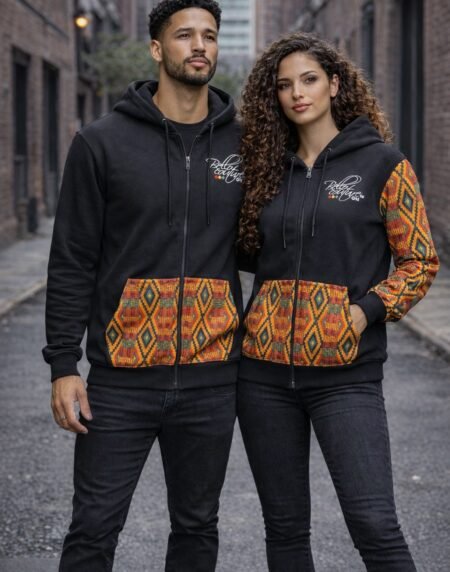 Unisex black zip hoodie with one African print sleeve on one hand. Soft, warm, streetwear-ready Afro-fusion style for everyday layering.