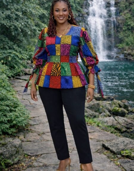 Elegant African print wrap peplum blouse in vibrant tones. Perfect for work or events, combining cultural style, flattering fit, and modern sophistication.