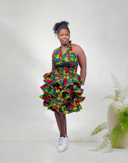 Bright and bold multicolored halter neck Ankara dress with a fun layered skirt — playful, chic, and full of cultural charm.
