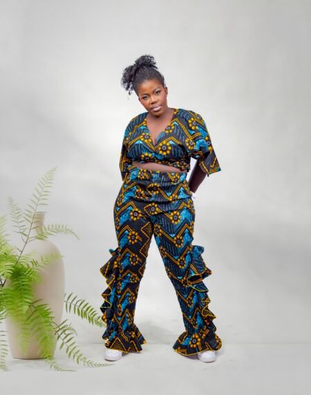 Vibrant African print two-piece set with elasticated crop top and high-waist wide-leg pants. Stylish, comfortable, and perfect for any occasion.