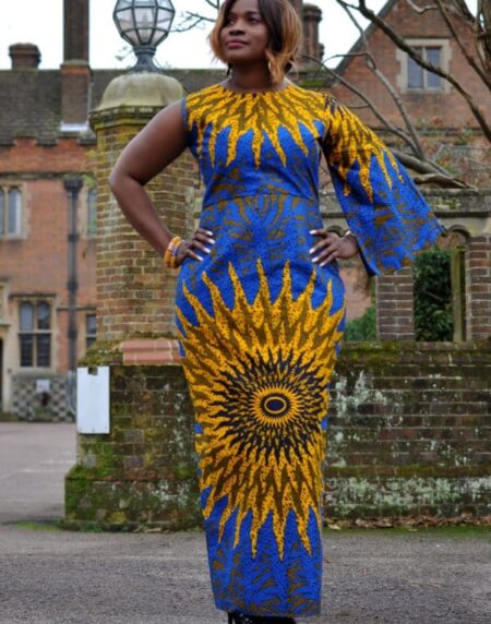 This gorgeous blue African print one sleeve pencil dress adorned with sunflowers is ideal for any special occasion or event. Paired with heels, this dress will certainly impress!