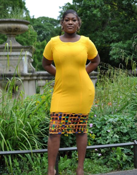 Looking for a unique African print midi? We have you covered with this vibrant yellow bodycon Ankara mesh dress. With a figure-hugging design, this midi dress can be custom made for any body shape and for a perfect, comfortable fit. The multi-coloured Ankara mesh illusion detail in a grid pattern