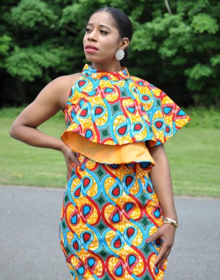 With bright yellow and orange tones and pretty African print, this Haniah two-piece skirt set with contrasting top is great for summer occasions. Dress up with heels for an elegant look!