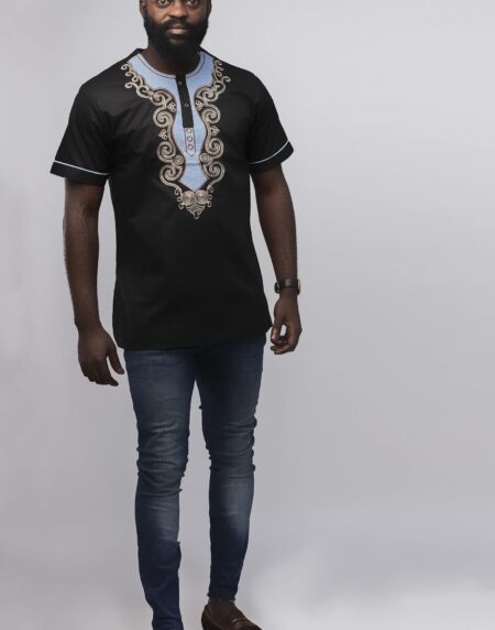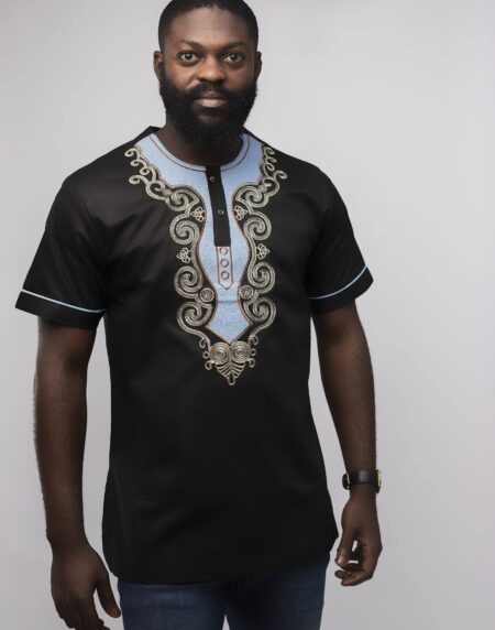 Looking for a stylish embroidery shirt that is also affordable? Then this Moses Slim Fit Embroidered African Shirt is ideal. With elaborate gold embroidery and light blue embellishment on the front, this black African inspired shirt is both eye-catching and unique. With a slim fit design, this shirt fits snugly