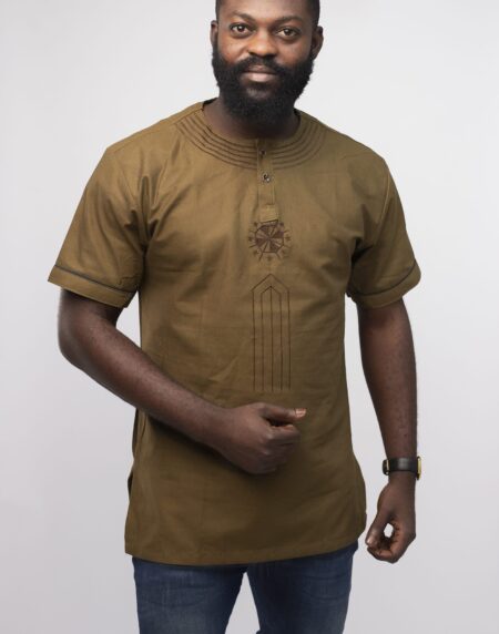 Looking for a smart embroidery shirt that is also affordable? Then this Momar Slim Fit Embroidered African Shirt is perfect. This khaki cotton shirt features an abstract minimalistic gold embroidery pattern around the neckline, down the chest and also black embroidery around the sleeves to give you a magnificent look.
