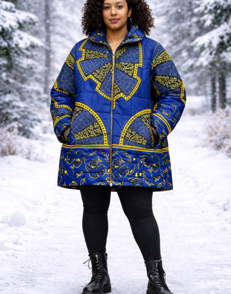 This gorgeous ladies blue and gold Akufo African print (Ankara) puffer coat is great for winter! A perfect blend of style and comfort, this coat has plenty of warmth.