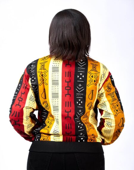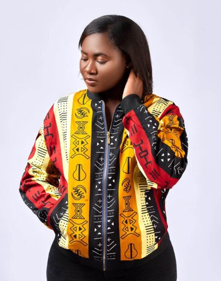 Brighten up your wardrobe with our ladies Kimani African Kente Print Bomber Jacket. Perfect for any occasion or everyday wear. Features cosy lining and two pockets for comfort and convenience.