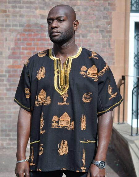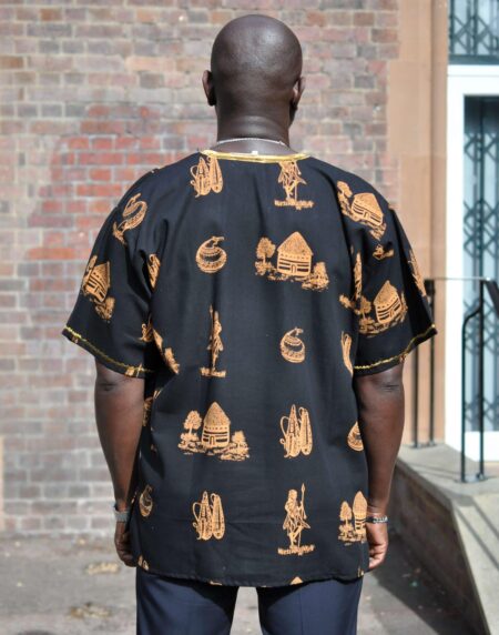 This black and gold shirt featuring traditional Kenya scenes and artefacts is perfect for every day wear or for an event. Ideal as a gift!