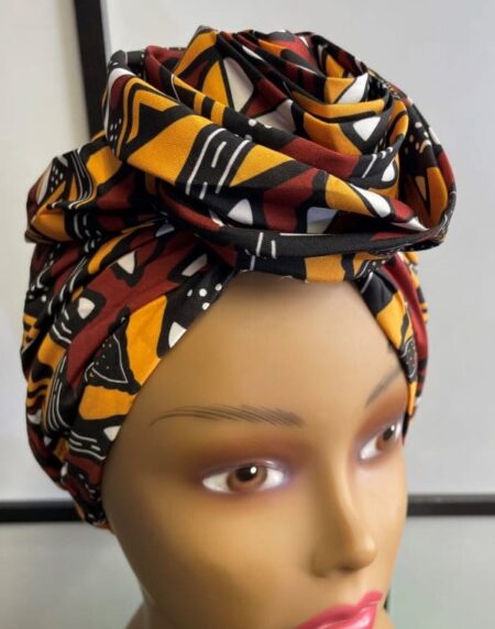 This pre-tied yellow & brown African print head wrap is the perfect addition to your wardrobe. With a pre-tied knot, this head wrap is already sewn in the shape of a turban so no fuss, just wear and go!