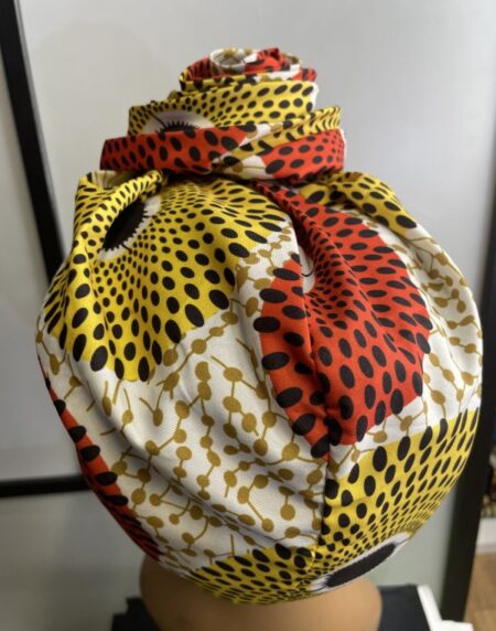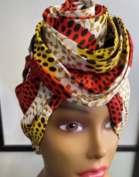 Already sewn in the shape of a turban to make it easier to put on. Saves you time getting your traditional head wrap just right!