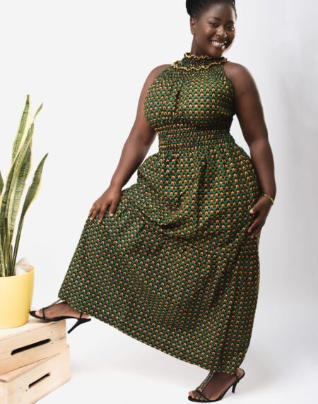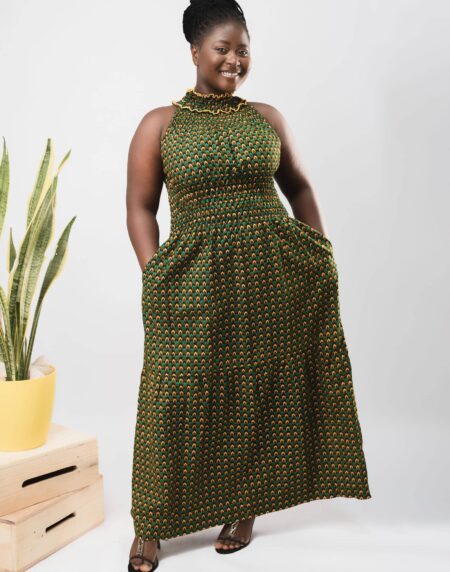 Spice up your seasonal wardrobe with this chic, Dark Green Ankara High-neck Halter Maxi! Pair with heels for occasions or sandals for a casual look.