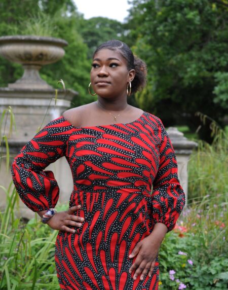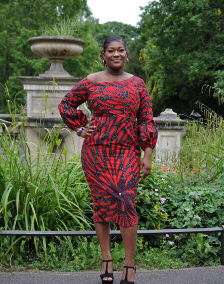 This beautiful Red Star Print Ruffle Occasion Dress is a must if you want to stand out from the crowd. Featuring an off shoulder, sweetheart neckline, peplum, ruffles and a front slit, this distinctive dress also has a unique Ankara print pattern of rings and stars.
