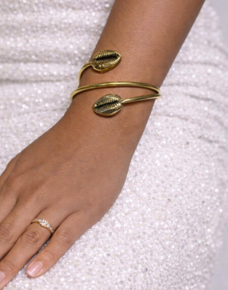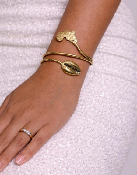 Adjustable gold cowrie shell cuff bracelet. Lightweight, symbolic, and versatile jewelry that adds cultural charm and elegance to any outfit.
