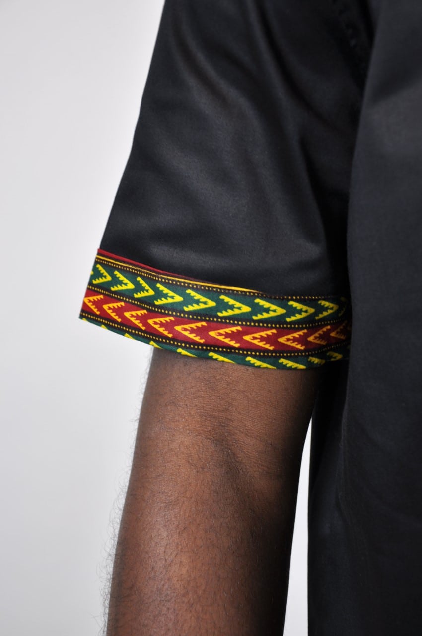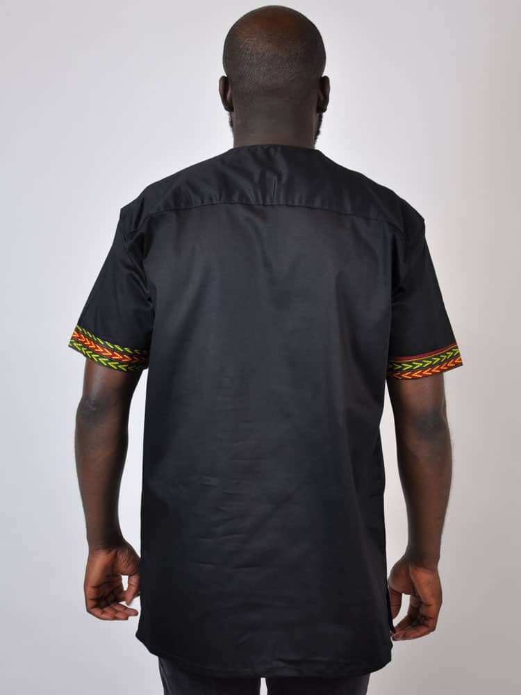 This Abimbola African Men’s Shirt is perfect shirt for every day or casual wear! The added bonus is that we can custom make this shirt to fit you perfectly.African inspired with a modern European twist, this short-sleeve black and African dashiki print shirt allows you to feel comfortable and free.