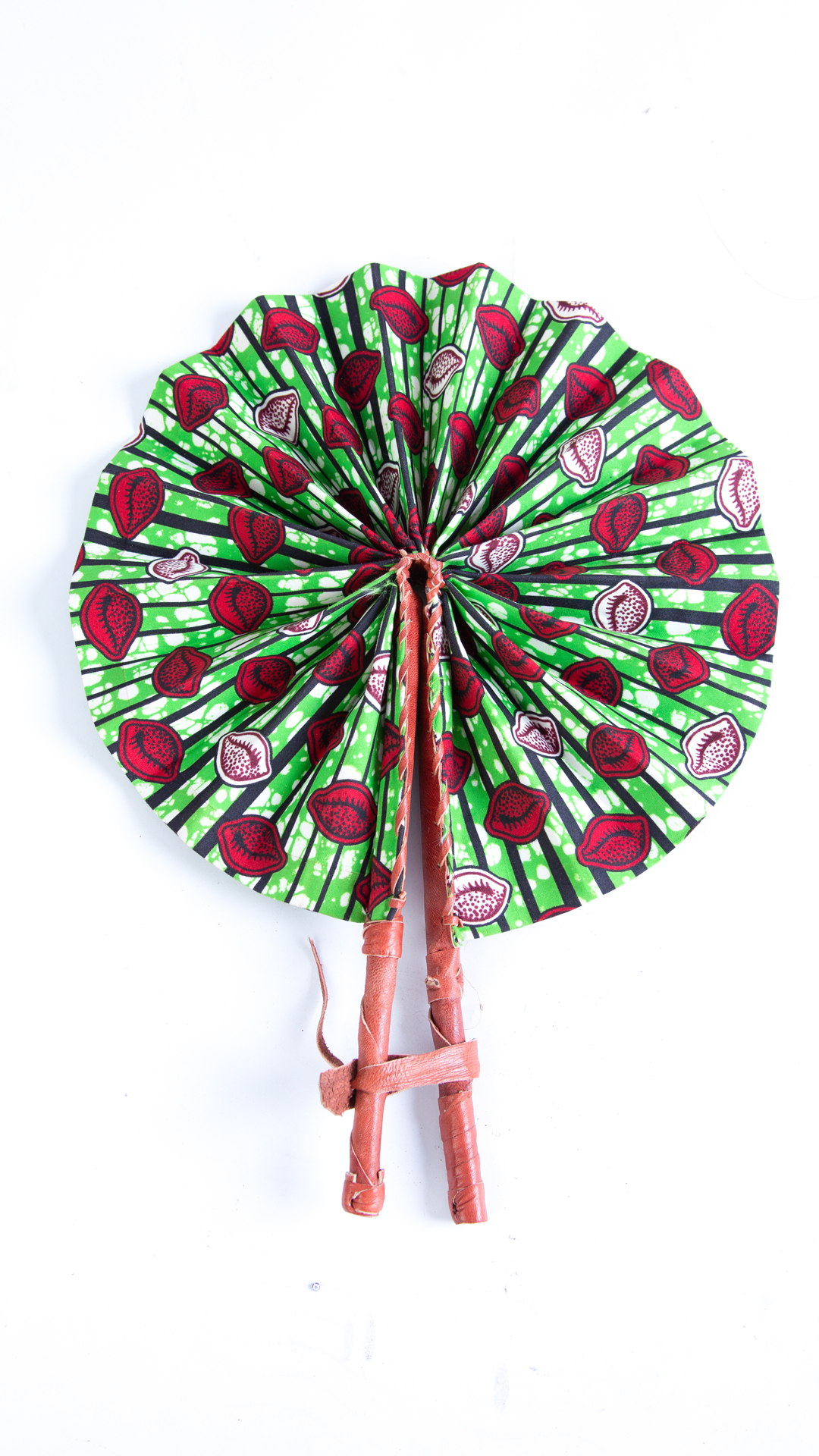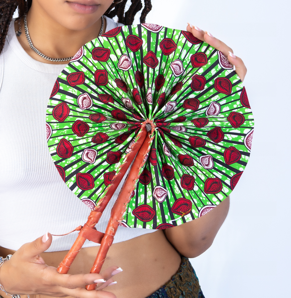 Furthermore, the fan boasts a round shape, allowing it to unfold gracefully to reveal the mesmerising Ankara print in all its glory. Moreover, the print is not only a burst of colour but also a testament to the artistry and craftsmanship behind each pattern. Also, the quality of the Ankara fabric ensures a durable and visually striking accessory.