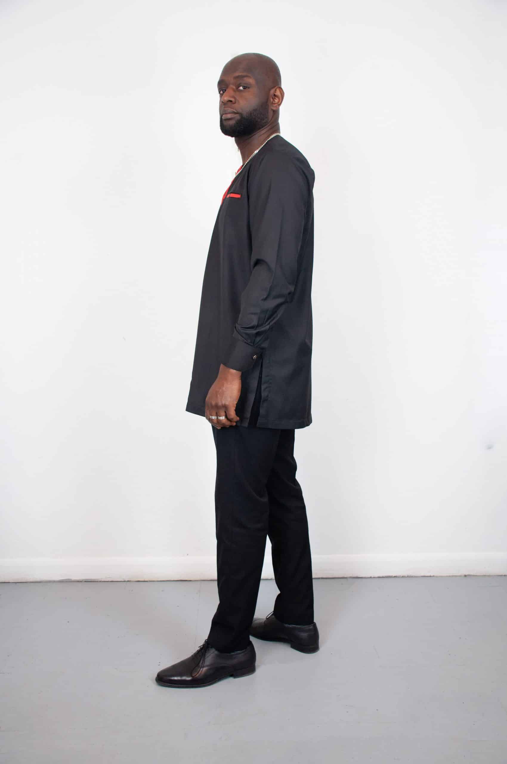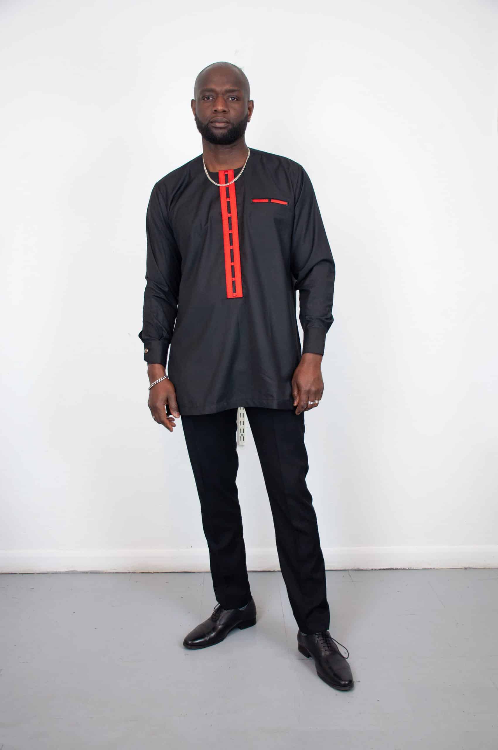Our Abuchi Black Traditional Suit is a traditional African suit design. Featuring a shirt, with a classic collar, and red embellishment on the front, and matching trousers. The trousers have a comfortable, regular fit and are designed to match the shirt perfectly.