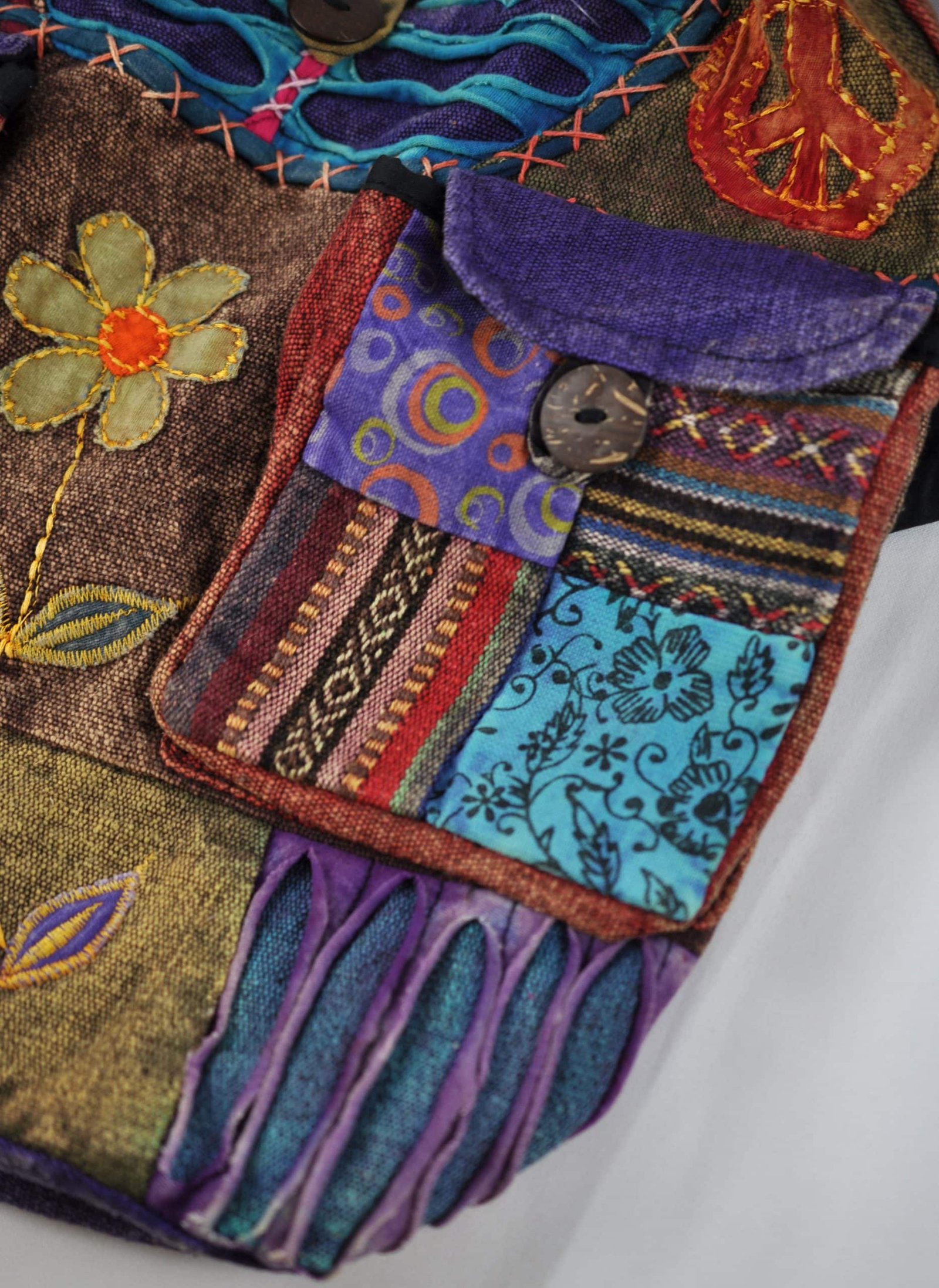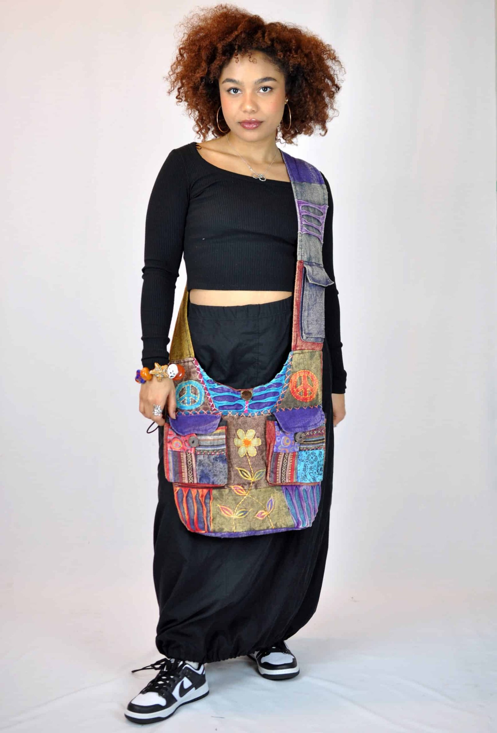 Our Hippie style Adese Patchwork Bag is the perfect gift for a loved one or even to treat yourself. The bag is a unique and stylish with its multi-colour patchwork design. Moreover, the bag has a pocket on the strap and two at the front of the bag for extra storage. In addition the bag has a beautiful design on its front.