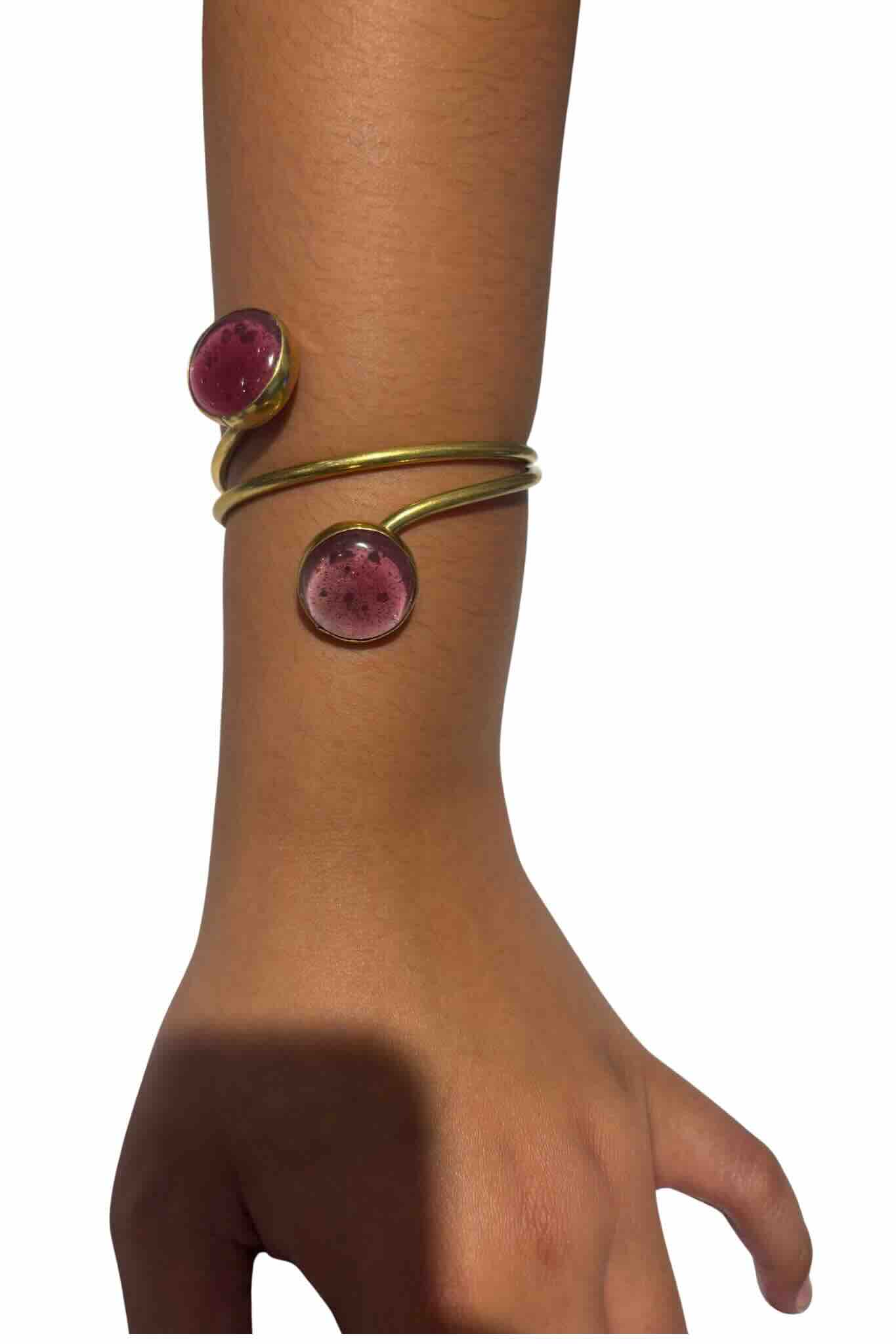 Two glossy resin stones highlight the bracelet. Each stone has delicate details, giving the piece an artistic and handcrafted feel. Because of the natural variations, no two bracelets are exactly alike. This makes every bracelet a one-of-a-kind accessory.