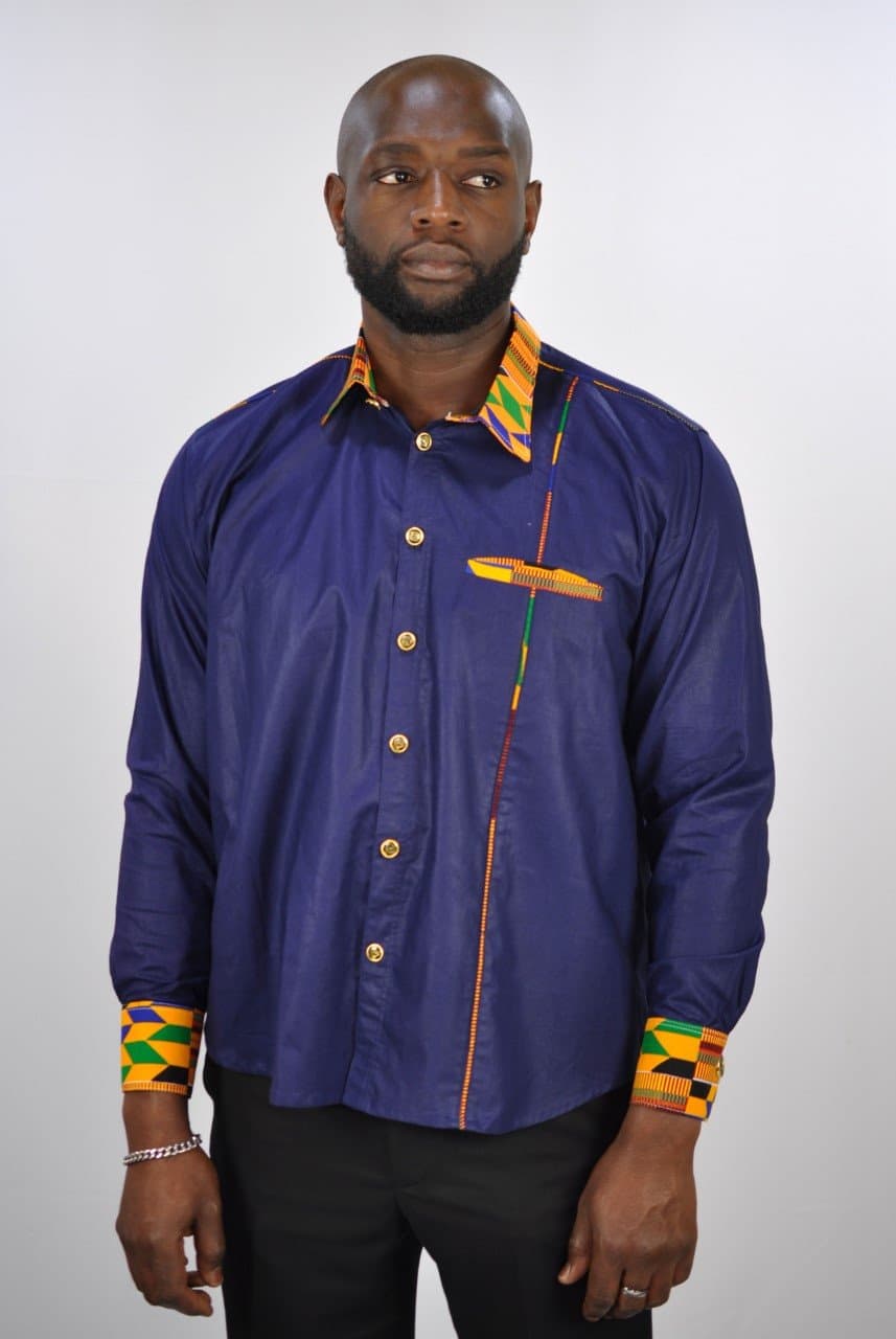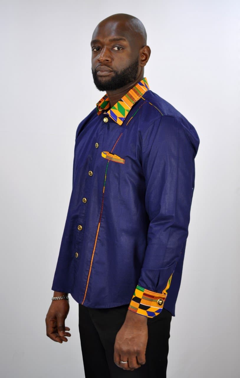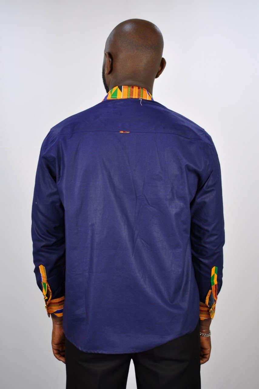 From our range of smart casual/business wear this shirt is versatile blue shirt made from polished cotton. In addition, this unique shirt is embellished, with a mixed print design made from Ankara cloth, on the pocket and inside the collar to add a touch of Kente. Perfect for when you need something appropriate for work that has a touch of African print!They are perfect for any smart casual event such as work or a relaxed top.
