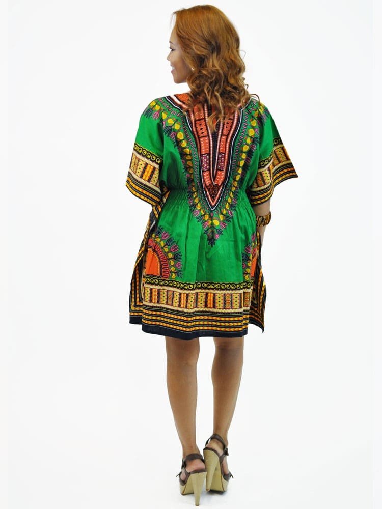 This Dashiki Kaftan or  Kimono is super comfortable and loose fitting. It has a stretchy elasticated waistline to give you the best fit.  It is a short, summery number designed with an appliqué of Dashiki fabric on the neckline.  This African Dashiki Kaftan is simple yet fabulous in shape and style!