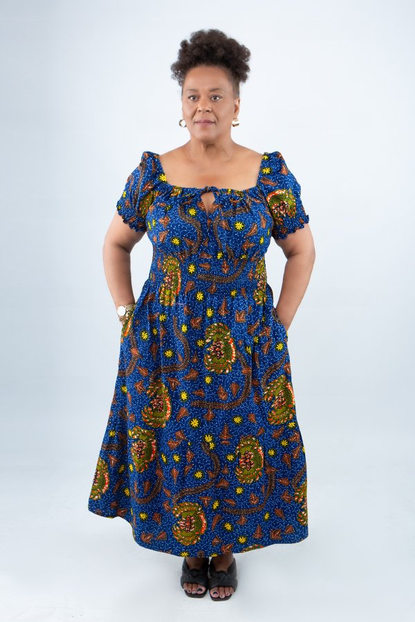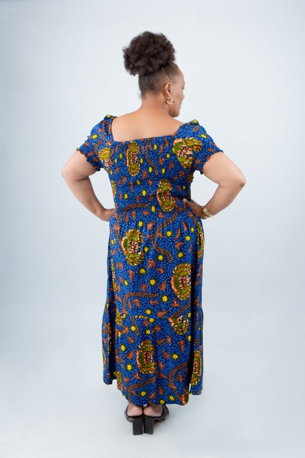 Handcrafted from high-quality 100% African wax print cotton, the dress features a rich blue background adorned with earthy tones and intricate patterns inspired by West African textile traditions. The result is a showstopping, eye-catching look that still feels grounded, warm, and wearable.