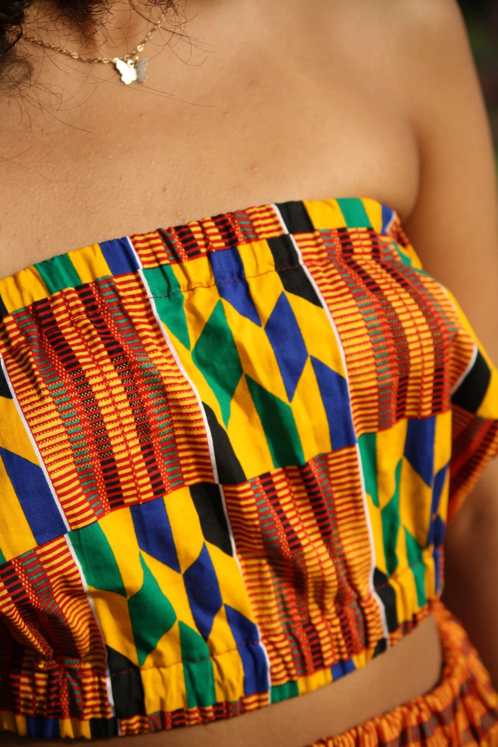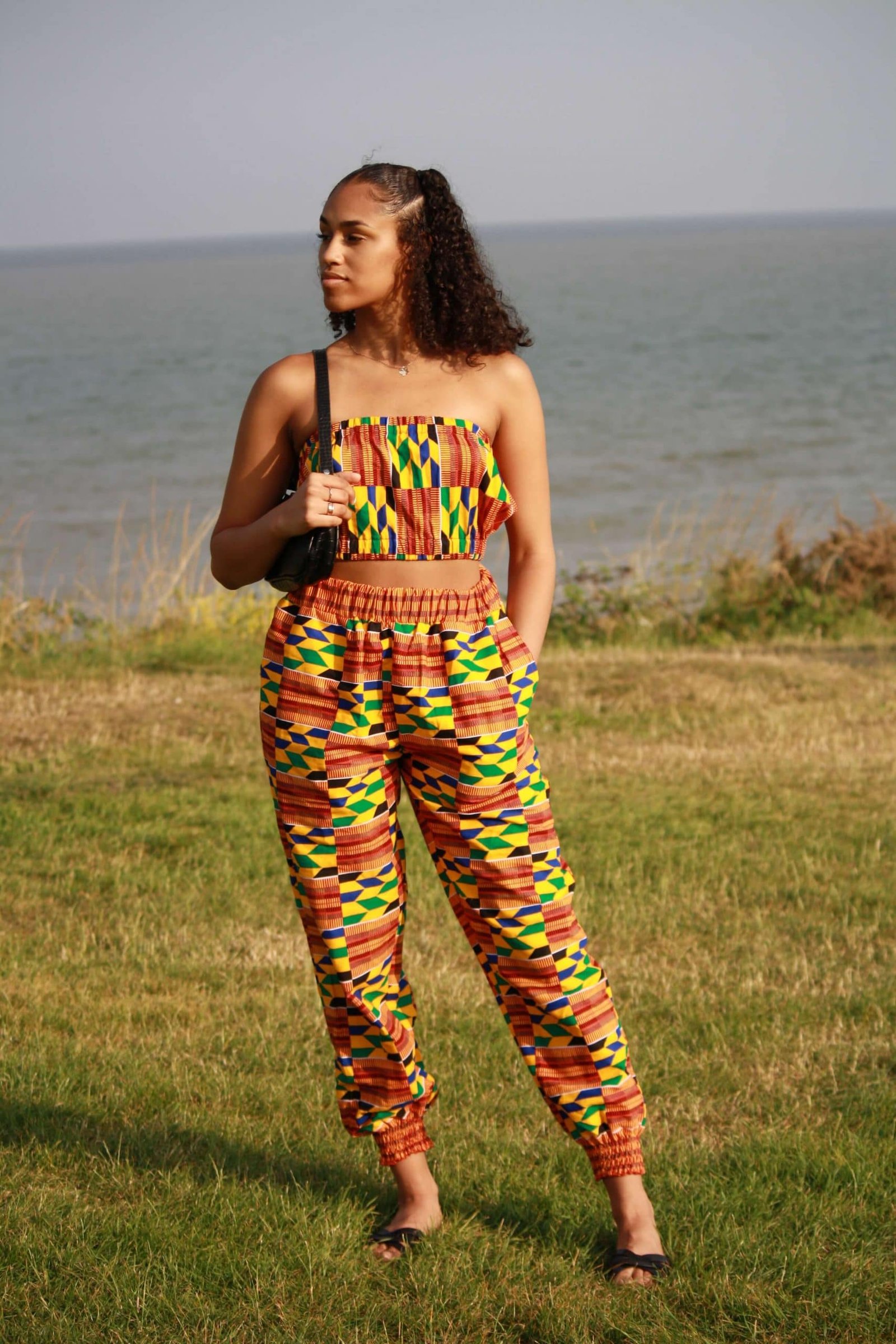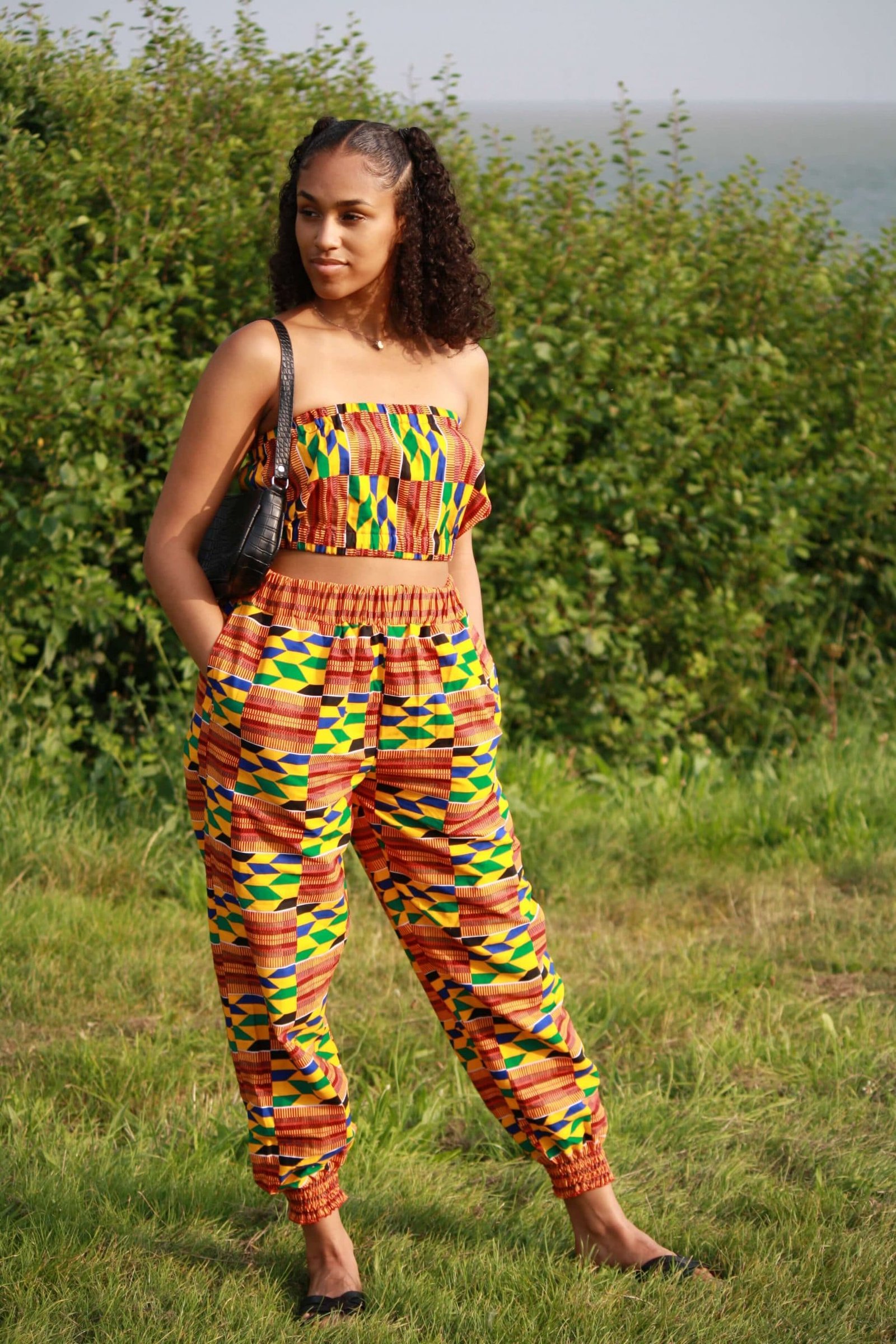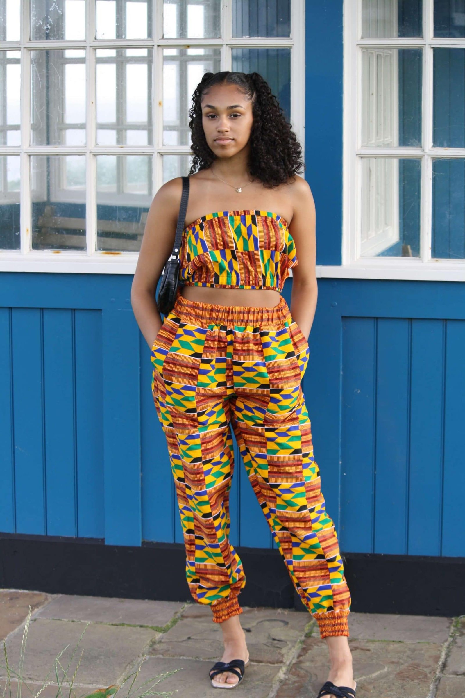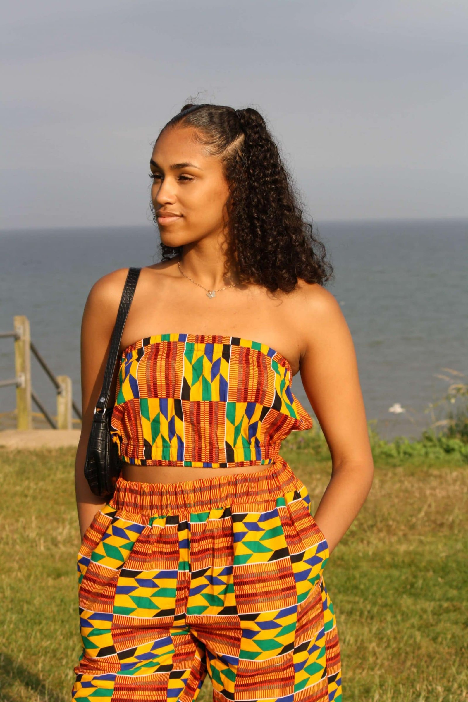 This African Kente Bandeau and Joggers Set is perfect for summer. Features an elasticated bandeau in African print which fits comfortably but securely. Comes with matching joggers, also elasticated at the waist, to complete the set. Pair with a simple necklace and/or some white trainers/sandals to finish the look.
