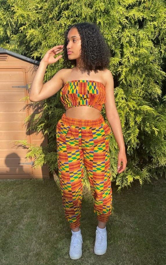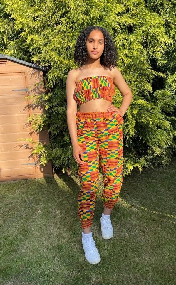 Purchase this African Kente Bandeau and Joggers Set as displayed or customise it! If you have your own design, we would love to hear about it! Let’s see if we can help you bring your design to life!