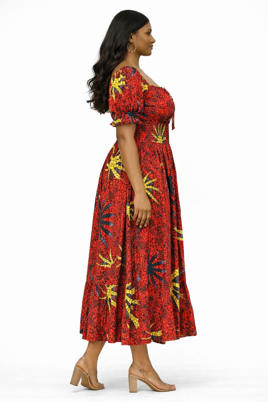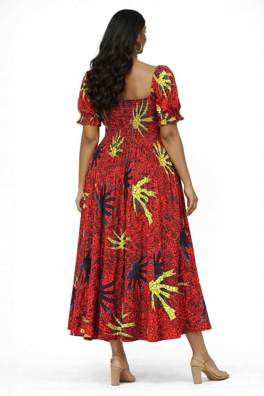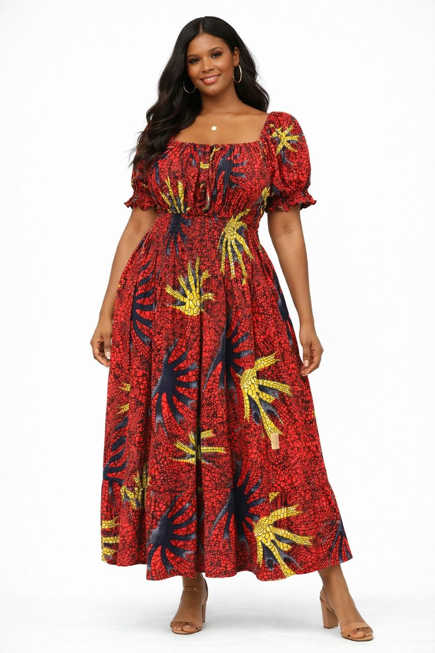 Crafted from authentic African wax print cotton, the vibrant patterns tell a story of tradition, strength, and individuality. Lightweight and breathable, this maxi dress is ideal for warm weather while still delivering a striking, sophisticated presence wherever you go.