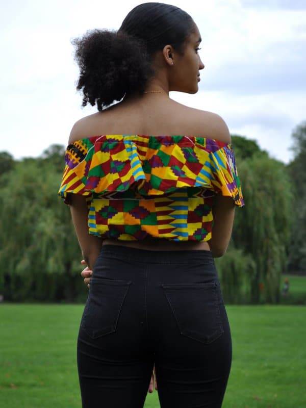 Looking for a crop top? Here you will find our lovely off shoulder frill crop top in African print. With a sexy off shoulder design, this top will take you from the beach to a party in style. Perfect to match with a skirt, shorts or some jeans in summer. Pair with our pretty waistbeads and a necklace to accentuate the bright colours. Made from lightweight cotton-feel fabric, this colourful top will make your outfit stand out. Perfect for a holiday, beach, travel or everyday wear.