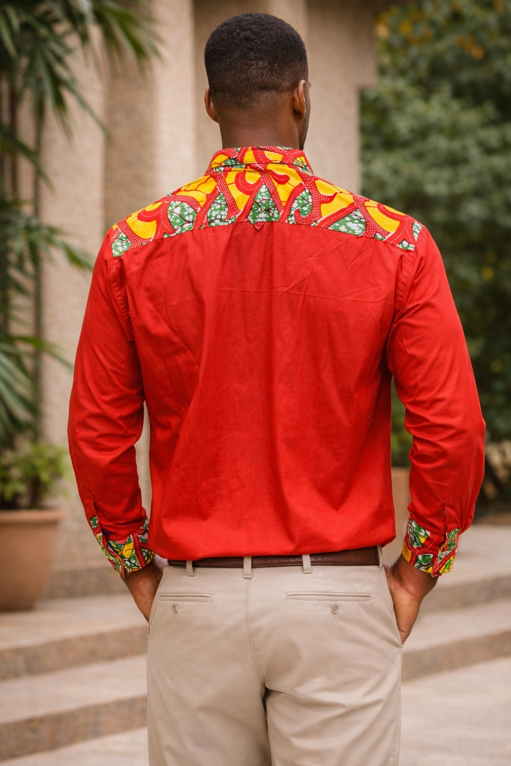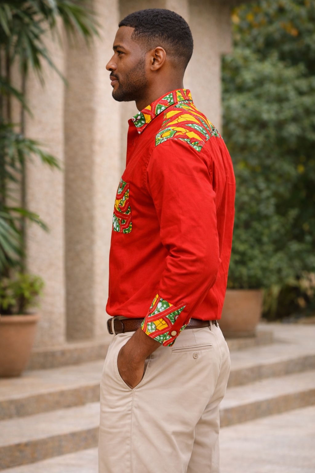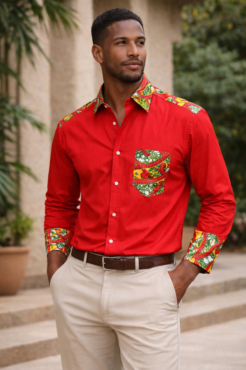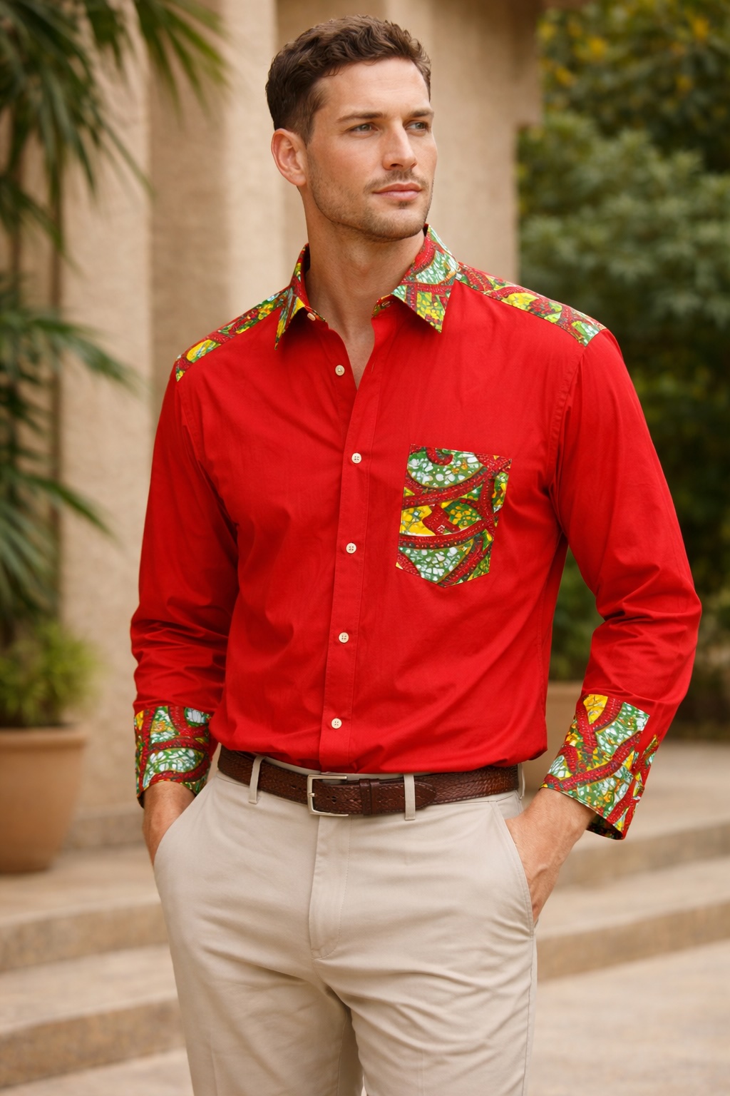 The standout feature is the striking African-inspired detailing in rich green, yellow, and white tones, showcased on the collar, cuffs, and chest pocket for a refined contrast against the bold red base. The rich colour accents and intricate print add depth and character to the design, elevating the overall look with a refined, artisanal finish.