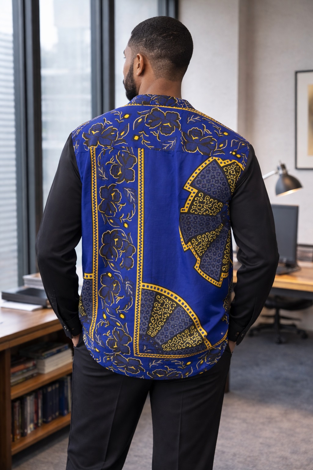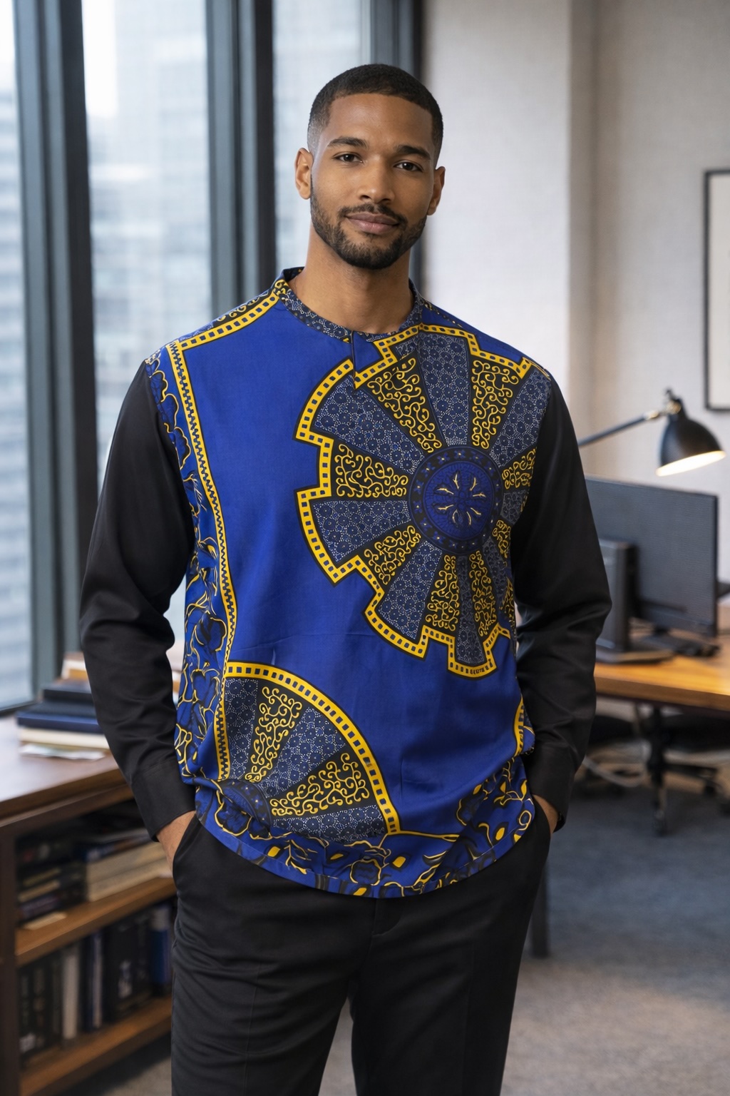 Men’s African print long-sleeve top in royal blue, black and gold. Bold cultural design with tailored fit – perfect for work and smart-casual wear.