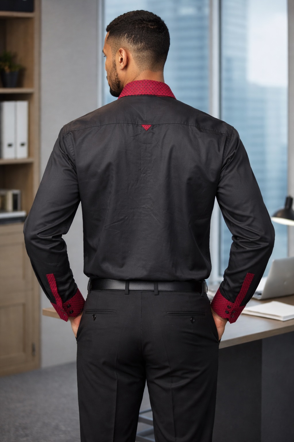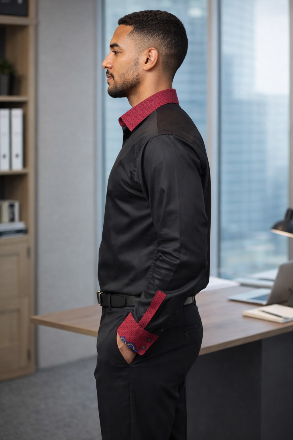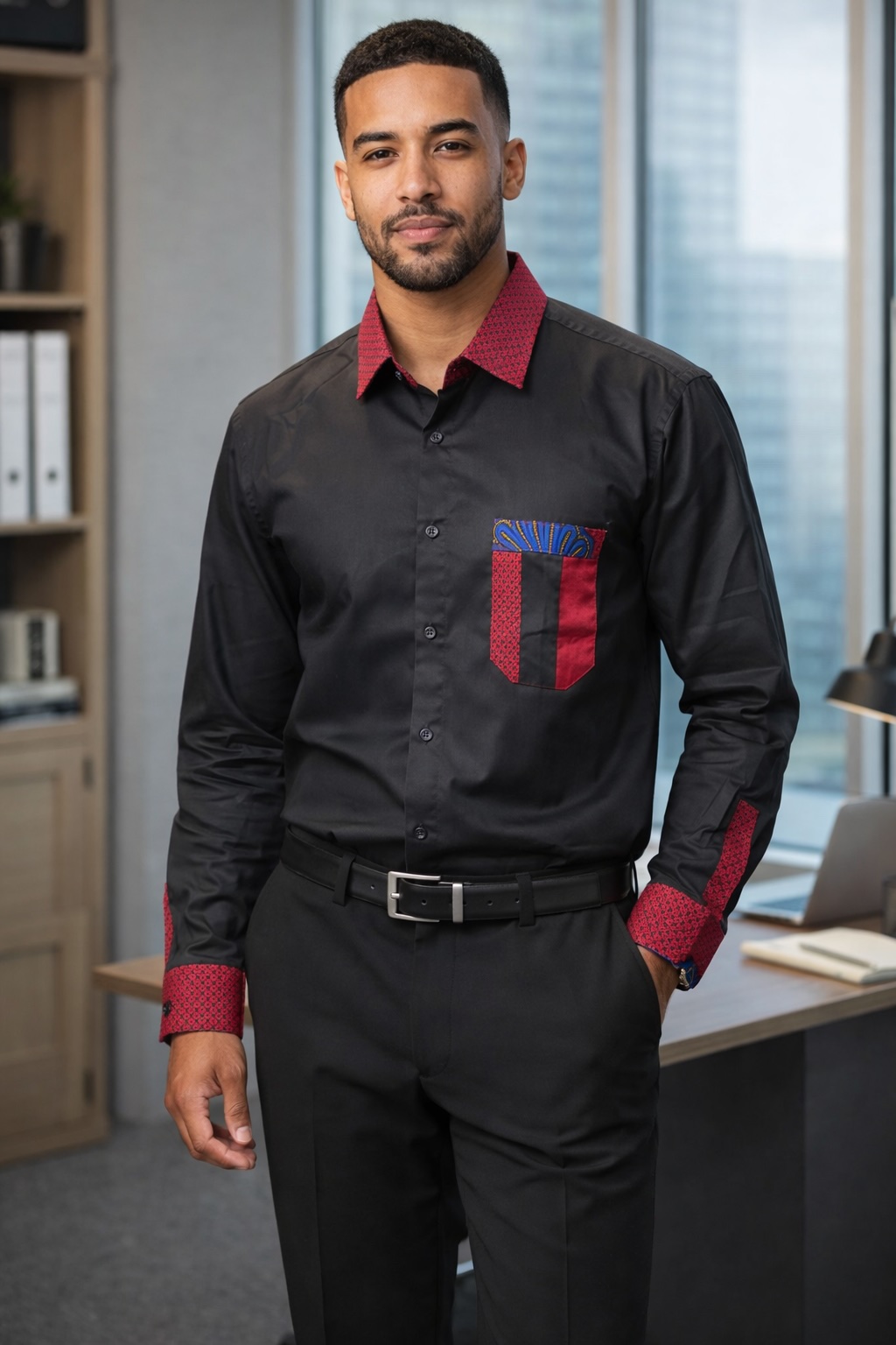 Men’s black long-sleeve shirt with red African print collar, cuffs and pocket detail. Smart, tailored fit – perfect for work and formal wear.