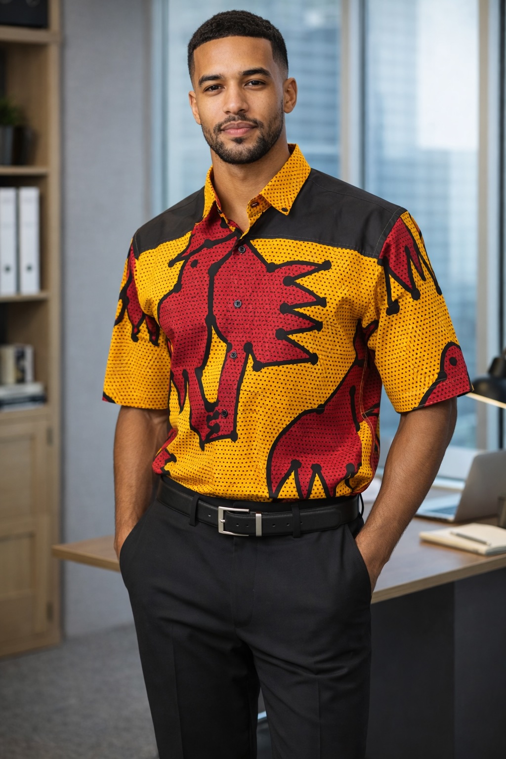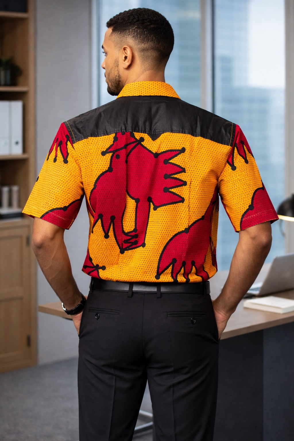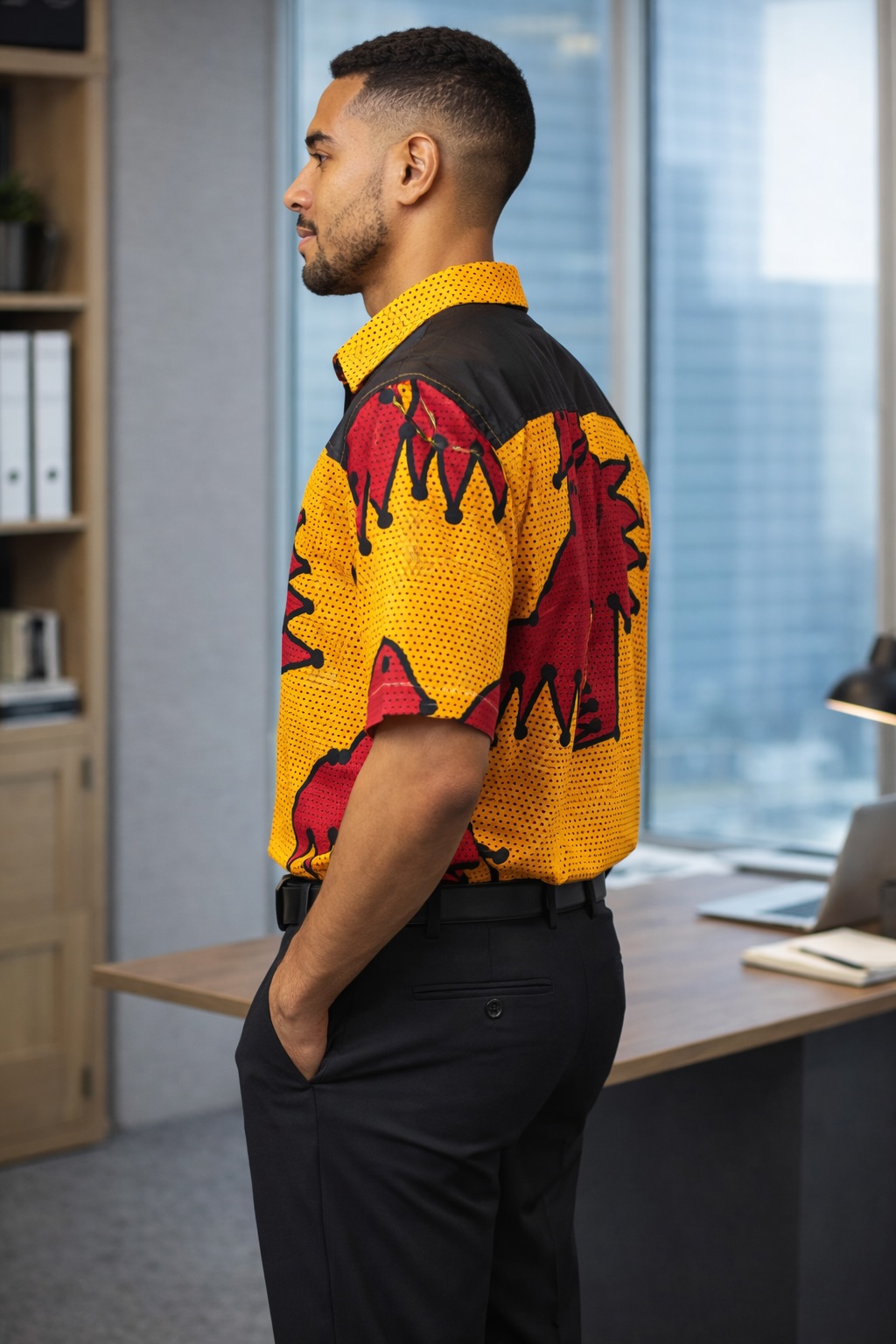 Men’s African Print Short-Sleeve Button-Up Shirt – Mustard & Red