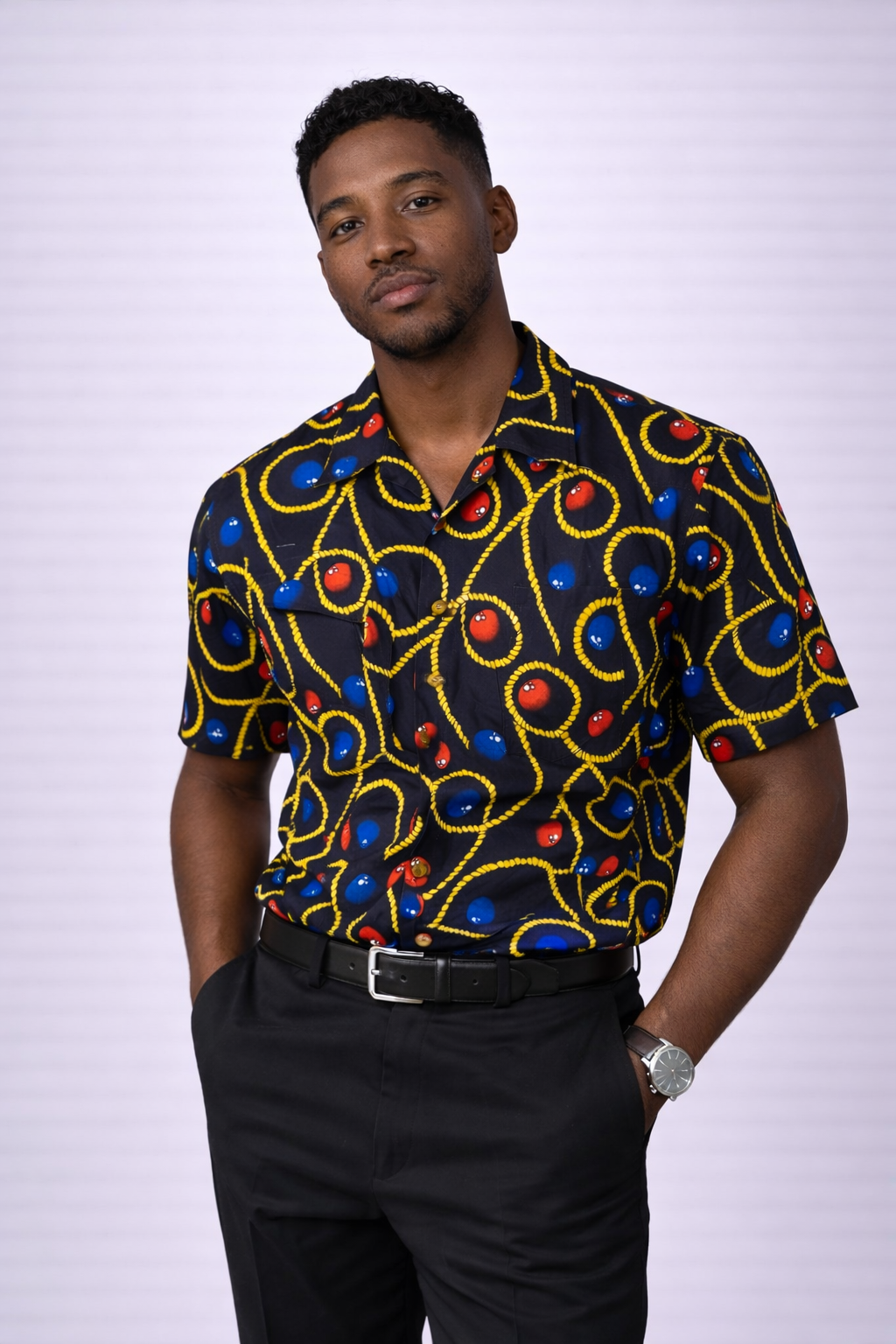 Men’s African Print Short-Sleeve Button-Up Shirt – Black, Red & Blue